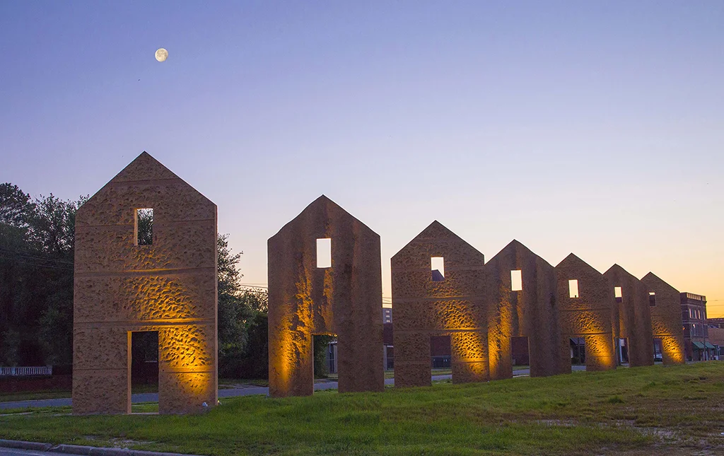 Thomas Sayre's earthcast installation Flue, a series of barn shapes formed by concrete cast in a furrowed field and pulled into place, is located in downtown Kinston, NC. © 2017 Bill Russ